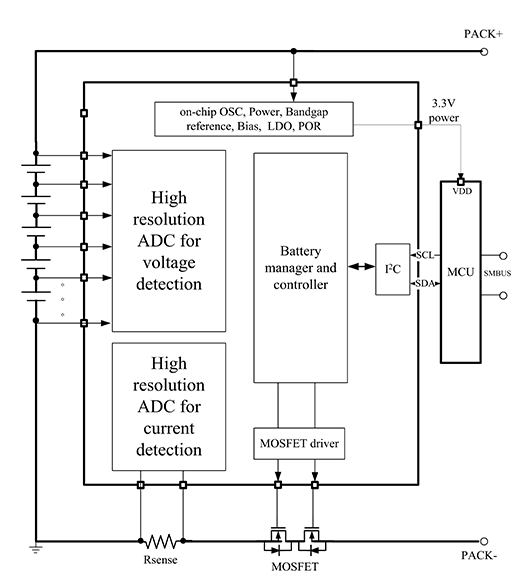 鋰電池組保護芯片HSM12X0系列包括HSM1220、HSM1230和HSM1240。該系列芯片內部集成了高精度ADC可以對電池組的電壓、電流以及溫度信號進行采集并通過I2C接口將數(shù)據(jù)傳遞給主機微控制器。該芯片還具有簡單的過壓保護、欠壓保護、過流保護以及短路保護,支持被動均衡。
