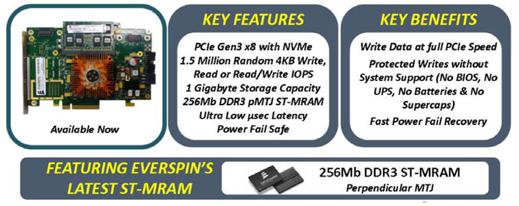 By using MRAM in its MLC NAND Flash-based enterprise solid-state storage systems, Skyera provide customers with enhanced data center fault recovery, reduced system downtime and lower total cost of ownership, without the drawbacks of capacitor-backed RAM solutions. The fast write speed and non-volatility of MRAM allowed Skyera to overcome any point of failure within the system memory while providing the best possible performance to enterprise-class applications.