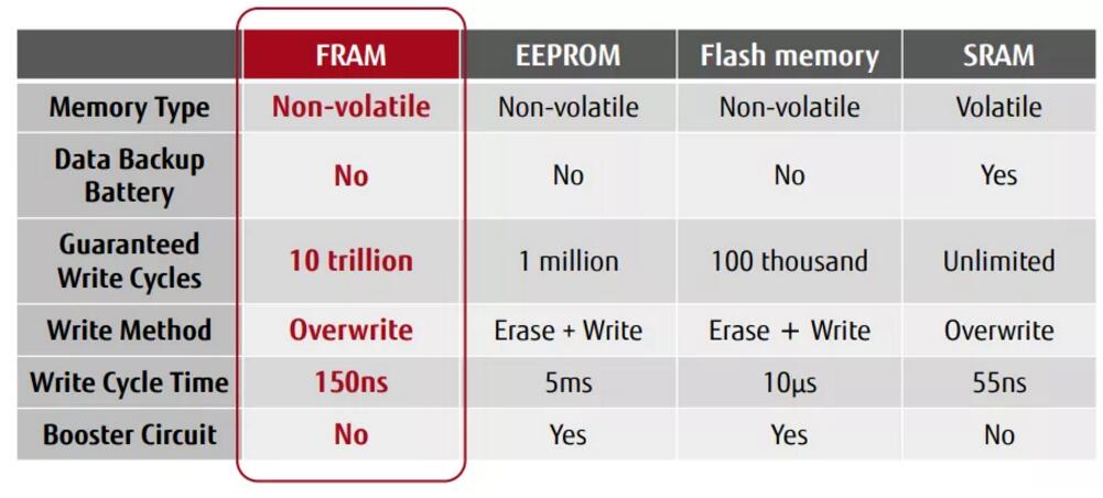 獨特性能成就技術“硬核”,F(xiàn)RAM是存儲界的實力派。除非易失性以外,F(xiàn)RAM還具備三大主要優(yōu)勢:高讀寫入耐久性、高速寫入以及低功耗,這是絕大多數(shù)同類型存儲器無法比擬的。