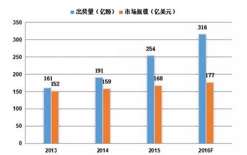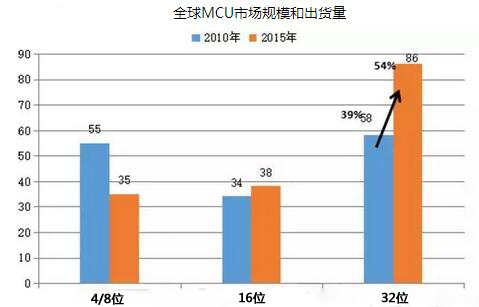 IC Insights研究報(bào)告顯示,2015年全球MCU市場規(guī)模達(dá)到168億美元,較去年增長5.6%,出貨量255億顆比去年提升12.4%,預(yù)計(jì)2016年全球MCU市場出貨量將突破300億顆大關(guān)。其中,2015年全球32位MCU出貨量超過4/8位MCU與16位MCU出貨量的總和,而且未來幾年應(yīng)該會(huì)保持30%左右的高速增長的水平。
