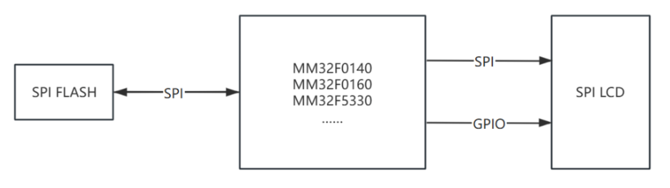 靈動微推出的SPI LCD顯示參考方案,通過SPI接口讀取外部SPI FLASH存儲芯片中存儲的字體、圖片等數(shù)據(jù)資源,再通過另外一路SPI驅(qū)動SPI LCD彩屏顯示。對于不同尺寸、不同分辨率的 SPI LCD 彩屏,客戶可以選擇靈動微電子不同規(guī)格的MCU來實現(xiàn)刷屏效果,硬件設(shè)計框圖如下所示: