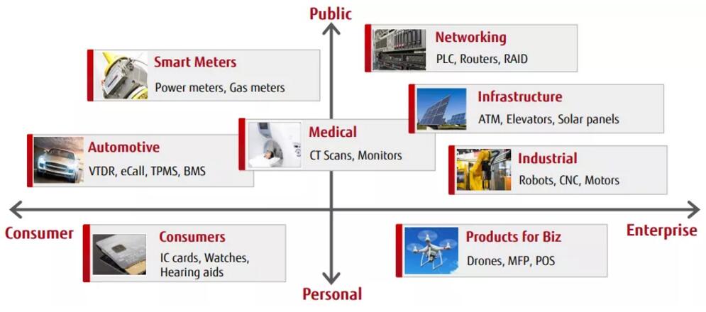 經(jīng)過市場的長期廣泛驗證以及技術(shù)的不斷突破,富士通FRAM產(chǎn)品已成功應(yīng)用于智能卡及IC卡等卡片領(lǐng)域、電力儀表及產(chǎn)業(yè)設(shè)備等工業(yè)領(lǐng)域,醫(yī)療設(shè)備及醫(yī)療RFID標簽等醫(yī)療領(lǐng)域、胎壓監(jiān)測及新能源汽車電池管理系統(tǒng)等汽車領(lǐng)域等等,涉及的應(yīng)用超過200種,幾乎覆蓋所有主要領(lǐng)域!