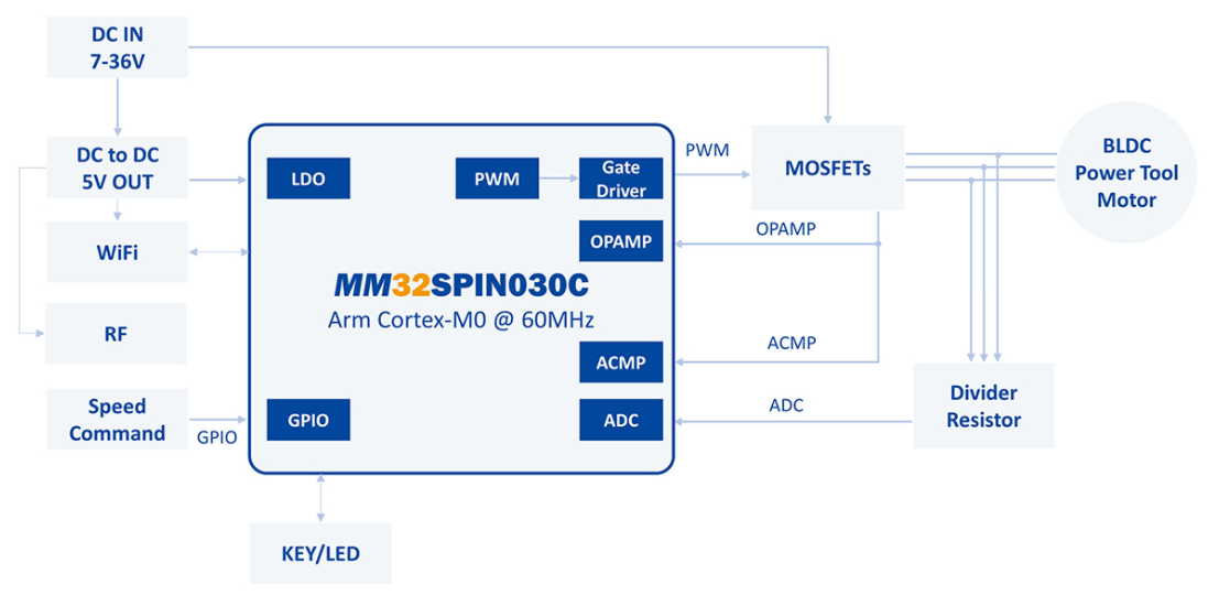 MM32SPIN030C這款MCU最大的亮點就是在其內(nèi)部集成了36V的3P-+3N預驅(qū),5V LDO高集成的電控SoC,可以直接驅(qū)動外部的6個P+NLMOS管,得益于內(nèi)部集成預驅(qū)的設計。