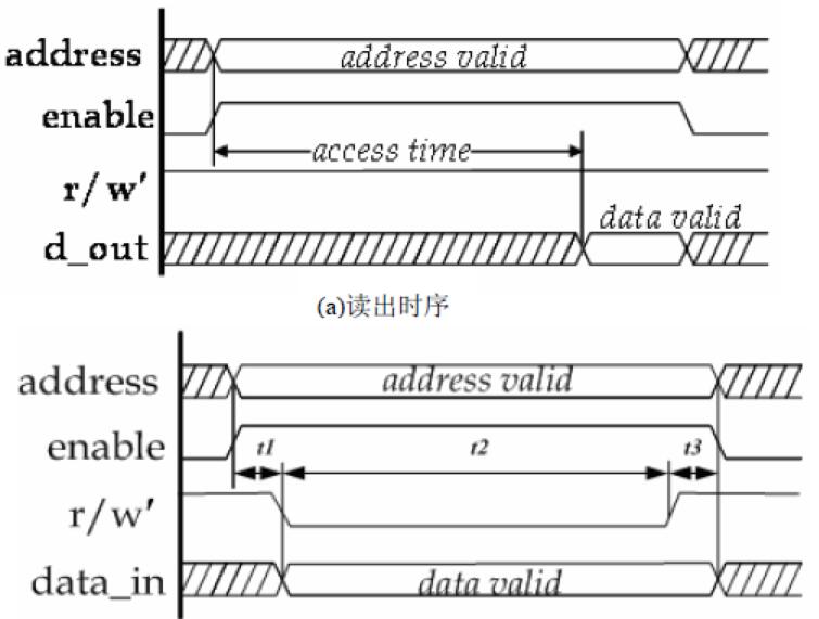 SRAM存儲器的讀寫時序。在讀出操作中,訪問時間(access time)就是指從地址有效算起,到有效數(shù)據(jù)輸出的時間;圖1.4 (b)中t1 是從地址和使能信號穩(wěn)定到寫信號有效所需的最小時間,t2 是寫信號無效之前必須保持的最小時間,t3是寫信號無效之后地址信號仍需保持的最小時間。t1、t2、t3 相加就是一個寫周期時間。