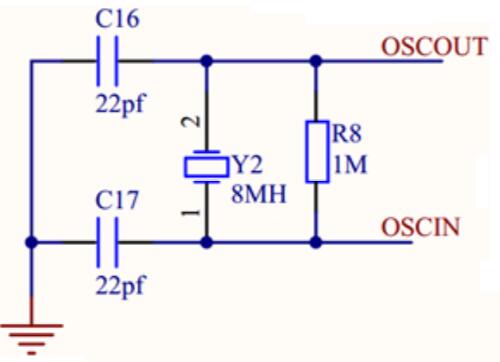 外部無(wú)源晶振電路如下圖所示,晶振兩腳接約 22pf 電容,并上 1M 反饋電阻。因芯片內(nèi)部沒(méi)有集成反饋電阻,為保證 XTAL 起振,必須接 1M 歐姆電阻;
