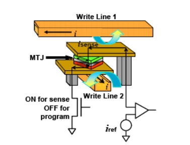 實(shí)現(xiàn)MRAM可靠存儲(chǔ)的一個(gè)主要障礙是高位干擾率。對(duì)目標(biāo)位進(jìn)行編程時(shí),非目標(biāo)位中的自由層會(huì)被誤編程。目前飛思卡爾半導(dǎo)體研究人員已經(jīng)成功解決了此問題,其方法是,在每次出現(xiàn)位狀態(tài)空翻時(shí),產(chǎn)生一個(gè)跳變位,它將磁矩的方向旋轉(zhuǎn)到同一方向。寫入線1和寫入線2上的反轉(zhuǎn)脈沖電流使極性旋轉(zhuǎn),從而不會(huì)干擾相同行或列的其它位元。