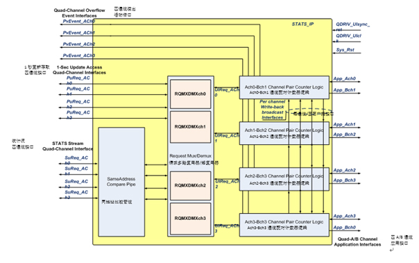圖2中的STATS_IP架構(gòu)模塊圖標出了三個子部件:每條通道的同地址比較管道(SACOMP)區(qū)塊、請求-復(fù)用-解復(fù)用(REQ_MXDMX_CHn)區(qū)塊以及每條QDR IV應(yīng)用通道1個的4個A-B通道配對計數(shù)器邏輯(ABCH_CTRL_CHn)區(qū)塊實例。
