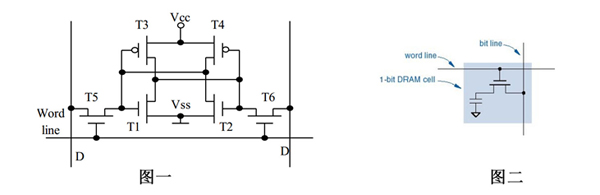 首先來(lái)看一張SRAM的基本單元結(jié)構(gòu)圖(圖一),再來(lái)看看DRAM的基本單元結(jié)構(gòu)圖(圖二)