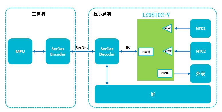 現(xiàn)場可重構(gòu)IC LS98102/-V采用QFN14封裝(車規(guī)級),供電范圍2.3V~5.5V,靜態(tài)電流100nA,12個可任意配置GPIO。該器件具有監(jiān)控2路NTC的溫度,溫度異常時發(fā)出中斷給SerDes端,主機(jī)控制發(fā)出關(guān)屏等指令信息擴(kuò)展GPIO口,用于控制顯示屏端其他外設(shè)。